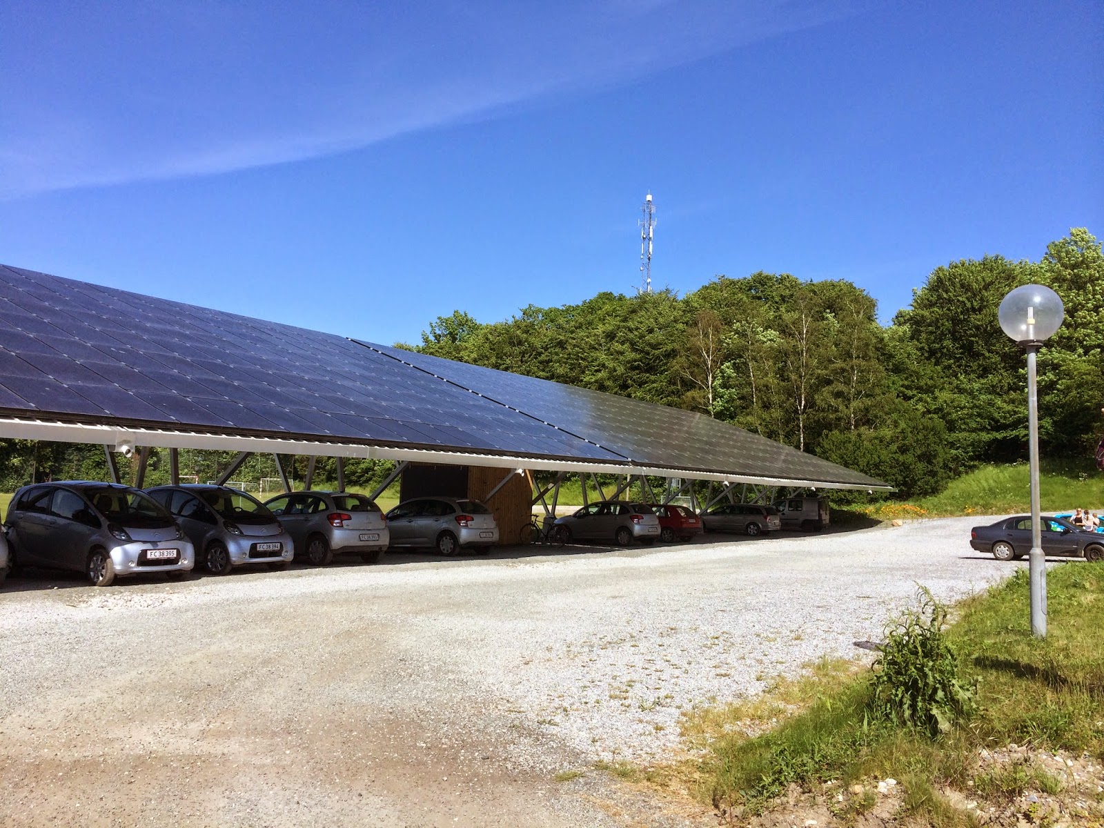 Les següents fotografies mostren un exemple de la implantació dels vehicles elèctrics. En aquest cas estan proveïts pel govern i els utilitzen els "funcionaris" danesos per dur a terme les seves tasques rutinàries, requerides pel seu lloc de treball, com poden ser els metges que van a fer visites a domicili. Com es pot veure, és un pàrking amb el sostre ple de plaques solars, i tots els cotxes aparcats són elèctrics, que es carreguen amb l'energia recollida pels panells.